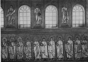Пророки, апостолы и процессия мучеников. Мозаики правой стены базилики Сант Аполлинаре Нуово в Равенне. Третье десятилетие VI века (фигуры мучеников исполнены между 557 и 570 годами)