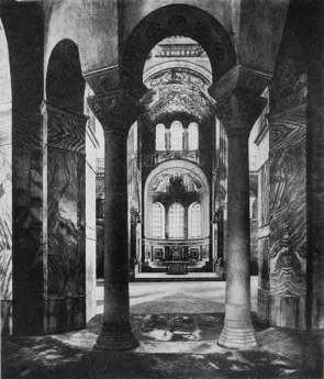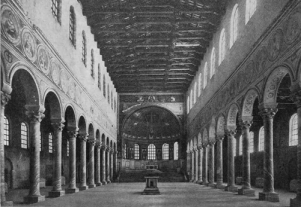 Самый крупный мозаический ансамбль эпохи Теодориха – мозаики Сант Аполлинаре Нуово, исполненные, вероятнее всего, на протяжении третьего десятилетия VI века. Воздвигнутая Теодорихом церковь, примыкавшая к его резиденции, была первоначально посвящена Спасителю и предназначалась для арианского культа. После изгнания готов из Равенны базилика была приспособлена к католическому богослужению, причем ее посвятили св. Мартину, епископу турскому, которого рассматривали как молот еретиков (malleus haereticorum). В это время часть мозаик была переделана. Наконец, в середине IX века, когда в базилику перенесли останки св. Аполлинария, она получила свое теперешнее название. Первоначально весь интерьер (см. выше), включая апсиду, был украшен мозаиками. Последние уцелели лишь на боковых стенах, где они располагаются тремя ярусами. В верхнем ярусе мы видим двадцать шесть сцен из жизни Христа (на левой стене «чудеса», на правой «страсти»), ниже, между окнами, представлены фигуры пророков и праотцев, еще ниже, над аркадой, изображены дворец Теодориха и Порто ди Классе, из которых выходят мученики и мученицы, направляющиеся к восседающим на тронах Христу и Богоматери (см. ниже). Как доказали недавние исследования, на фоне дворца и стены Порто ди Классе первоначально находились фигуры, которые были уничтожены при переделке мозаик епископом Аньелло в 60-х годах VI века. Эти фигуры изображали людей из свиты Теодориха. Таким образом, к Христу и Богоматери первоначально подходили не мученики и мученицы, а возглавляемые Теодорихом и его супругой процессии вестготских придворных, несомненно изобиловавшие портретными изображениями. Последние как раз и вызвали наибольшую оппозицию у католического духовенства, решившего их уничтожить в порядке damnatio memoriae.