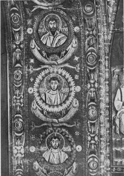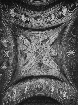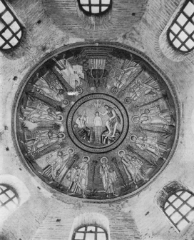 В основу мозаики купола (см. ниже) положена триумфальная тема Христа-победителя: в центре представлено «Крещение», т.е. сцена, в которой Христос получает инвеституру как сын божий, иначе говоря, он выступает здесь в ореоле триумфатора; его окружают двенадцать величаво выступающих апостолов, первыми принявших крещение; они несут в руках короны, собираясь их вручить небесному властителю; ниже идет пояс с изображением отделенных друг от друга канделябрами архитектурных сооружений, воспроизводящих, в поперечном разрезе, алтарное пространство базилики: портики фланкируют апсиды, на фоне которых стоят увенчанные крестом троны либо алтари с лежащими на них раскрытыми евангелиями; в портиках размещены епископские (?) седалища с коронами либо различные деревья, возвышающиеся над низкими парапетами. На первый взгляд, изображения архитектурного пояса кажутся мало согласованными с тематикой центральной части купола. На самом же деле здесь прославляется в иносказательной форме Христос как владыка небесный, на что намекают четыре раза повторенная этимасия, евангелия на алтарях и епископские (?) седалища (последним в литургической символике, вместе с алтарем, который они окружают, придавалось мистическое значение божественного трона).