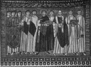 Юстиниан (см. ниже) изображен приносящим в дар церкви тяжелую золотую чашу. Он представлен, как и все его окружающие, в строгой фронтальной позе. Голова его, увенчанная диадемой, окружена нимбом. Так как царь обычно снимал диадему при входе в нарфик, где его встречало духовенство, то есть основание полагать, что на мозаике запечатлен тот момент, когда процессия еще не вошла в церковь. Справа от Юстиниана стоят двое мужчин в патрицианских одеждах – это, вероятно, известный византийский полководец Велисарий и один из высших чинов византийского двора praepositus (только он и патриарх имели право возлагать диадему на главу императора). Левее мы видим телохранителей, чьи фигуры полуприкрыты парадным щитом с монограммой Христа. Из-за левого плеча Юстиниана выглядывает фигура пожилого человека в одежде сенатора, являющаяся несомненным портретом (эту фигуру долгое время необоснованно принимали за изображение банкира Юлиана Аргентария). Правая часть композиции заполнена фигурами епископа Максимиана (с крестом в руке) и двух диаконов, один из которых держит евангелие, а другой – кадило. Мозаичист допустил явный композиционный просчет, так как крайняя правая фигура едва уместилась на отведенном ей месте, и ее слегка вытянутая левая рука, как бы указывающая путь для процессии, перерезает поддерживающую кассетированное перекрытие колонну. В этом групповом портрете Юстиниан и Максимиан выступают как авторитарные представители светской (imperium) и церковной (sacerdotium) власти, причем первый облечен императорской potestas, а второй – епископской auctoritas. Поэтому их фигуры занимают доминирующее место; по той же причине над головой епископа красуется горделивая надпись – Maximianus. Роскошные костюмы дали возможность мозаичистам развернуть перед зрителем все ослепительное богатство их палитры – начиная от нежных белых и пурпуровых тонов и кончая ярко-зелеными и оранжево-красными. Особой тонкости исполнения они достигли в лицах четырех центральных фигур, набранных из более мелких кубиков. Это позволило им создать четыре великолепных по остроте характеристики портрета, в которых, несмотря на наличие ярко выраженных индивидуальных черт, есть и нечто общее – особая строгость выражения и печать фанатической убежденности.