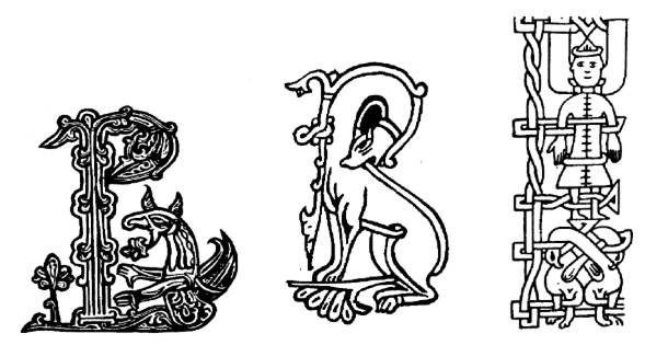 Чудовищный стиль медленно и постепенно отвоевывал от Византии сначала заглавные буквы, затем заставки. В «Изборнике» Святослава заставки и большинство букв еще хранят византийский характер. Правда, животные и птицы появились уже, но они робко стоят еще вне рамок самой заставки, являются как бы дополнительными украшениями и не носят ясно выраженного чудовищного характера. В Остромировом Евангелии, принадлежащем к тому же XI веку, чудовища появляются в буквах. Такова, например, воспроизводимая нами буква «В» с крылатым грифоном вместо нижнего завитка.