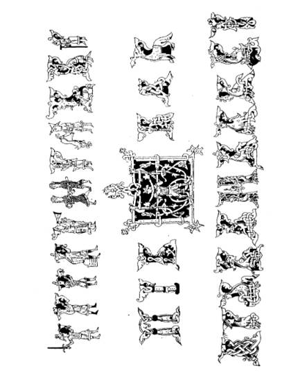 В XIV веке чудовища и сплетения завоевывают и заставки и буквы. В буквах Академического Евангелия XIV века В.В. Стасов открывает целую композицию, неизвестного, впрочем, содержания. В Псалтири Сергиевой лавры изображение царя Давида оказывается окруженным чудовищными сплетениями. В другой Псалтири (Публичной библиотеки) чудовища проникают даже на изображение царских врат.
