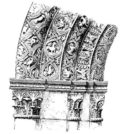 Резьбою из камня были богато украшены, как уже говорилось, владимирские храмы. В особенности интересна эта резьба на Дмитриевском соборе. Композиция повторяется в общих чертах на всех трех стенах храма, в центре фигура святого, сидящего на троне, вокруг его – звери, птицы и травы. По остроумной догадке Н.П. Кондакова, эти композиции являются, так сказать, скульптурною иллюстрацией к широко известному древней Руси стиху о Голубиной книге.