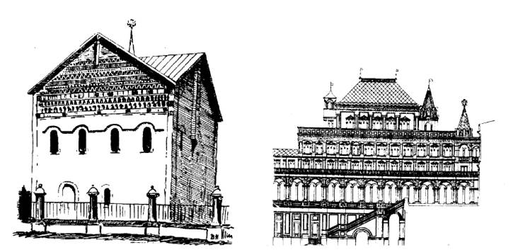 По мере развития общественных потребностей Московской Руси, естественно возрастали и требования, предъявляемые к гражданской архитектуре. Деревянные хоромы постепенно сменялись каменными. Вызываемые из Западной Европы фряжские строители должны были проявлять творчество в области не только церковной, но и гражданской архитектуры. Здесь они, конечно, могли чувствовать себя свободнее, их не стесняли уже церковные традиции, требование пятиглавия, стройки по тому или иному образцу. Но окружавшие приезжих гостей творения деревянного зодчества были так оригинальны и самобытны, так тесно были связаны и с русскою жизнью и с русскою природой, что иноземные учителя невольно подпадали под влияние местных архитектурных традиций.