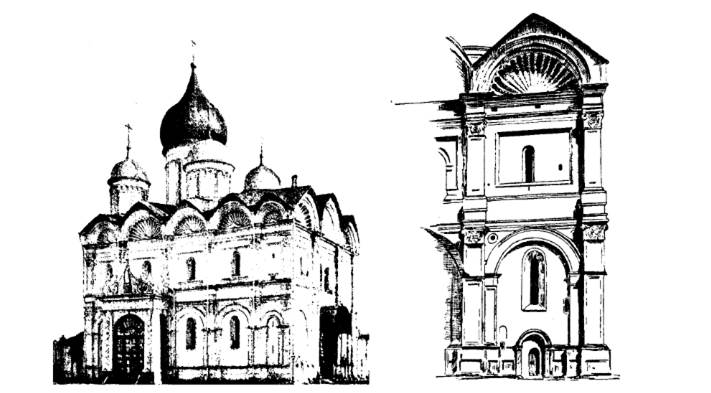 Когда древний владимирский собор подвергся расширению и был окружен более низкою пристройкой, то подножие средней его главы оказалось как бы окруженным рядом закомар, словно стоящим на пьедестале из арок. В Благовещенском соборе центральная глава уже сознательно окружена рядом арок, заостренных вверху в виде «кокошников», в «московском» вкусе.
