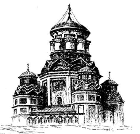 Появляются, наконец, и такие шатровые храмы, где вокруг главного, самого высокого шатра группируются более низкие шатровые крыши алтарей или приделов.