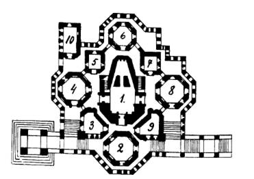 Еще позднее появляются шатровые храмы с приделами. Центральная шатровая часть обстраивается иногда со всех четырех сторон, и план креста.