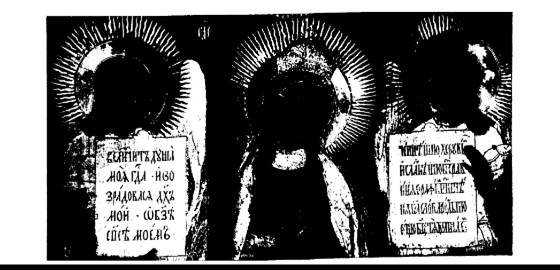 Теми же принципами живописности были проникнуты и недавно уничтоженные фрески XVI века в московском Благовещенском соборе, созданные неизвестными мастерами, быть может, принадлежавшими к итало-греческой школе иконописи.