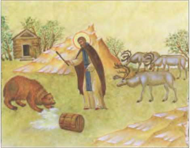 Затем он отпустил медведя. После этого дикие звери больше не трогали обитель, и монастырские олени могли спокойно пастись» [5, с. 674].
