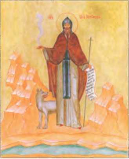 «Однажды иноки пришли к Святому и сказали ему, что дикие звери причиняют большой вред. Святой, услышав это, сильно опечалился, ибо имел жалость как к людям, так и к животным, стал молиться и просить Бога, чтобы все звери той пустыни собрались к нему. Окончив молитву, Святой вышел из пещеры, и что же? Перед ним было множество зверей со всеми их детенышами.
