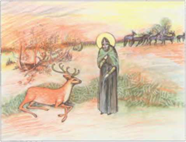 И лишь только Святой это произнес, олень, как бы пораженный какой-либо стрелой, упал на землю и лежал неподвижно, тогда как остальные олени убежали» [1, с. 142].