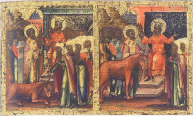 И тотчас лев, услышав имя Святого, обратился назад и побежал в пустыню» [1, с. 331].