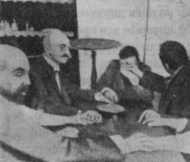 Рисунок 4 дает нам представление о так называемой левитации, т. е. подъеме стола, при участии того же медиума Евзапии Паладино, профессора Скиапарелли, который находится налево от стола, и у него видны только лишь одни руки, затем профессора Брофферио и г. Дюпрейль, который одну руку левую, держит на столе, а правой наблюдает за коленами медиума. Этот сеанс также имел место в Милане в 1892 году.