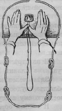 Следующий рисунок 74 воспроизводит феномен, который был в первые проявлен при том же медиуме Слэд. Но этот феномен был неоднократно воспроизведен в других кружках и при других медиумах. Он показывает, что на гладкой бечевке, оба конца которой были наглухо припечатаны к другому предмету или друг к другу, с помощью духов были сделаны узлы.