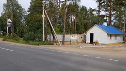 - Временный храм находится в 50 м. от автобусной остановки «Станция Васкелово — Лесное» (автобус 611А) на ул. Коробицына. От остановки повернуть вправо, идти до поворота.