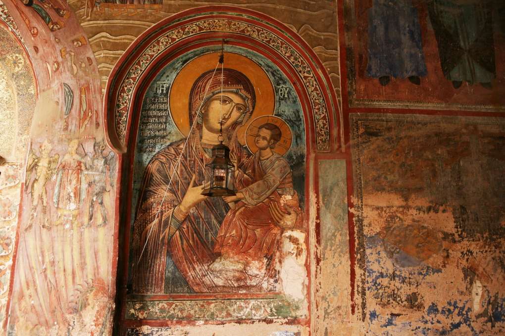 Фреска перед входом в храм. Этот образ Божией Матери прославился чудотворениями.