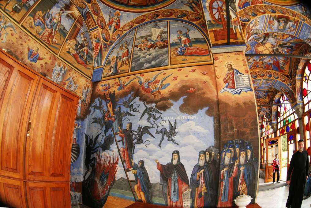 Фреска, показывающая, как нерадивых монахов сбрасывают с лестницы подвижничества бесы. Ладно, монахи, а нам с вами бесы не препятствуют взбираться вверх? Нас не губят, не сталкивают в бездну?..