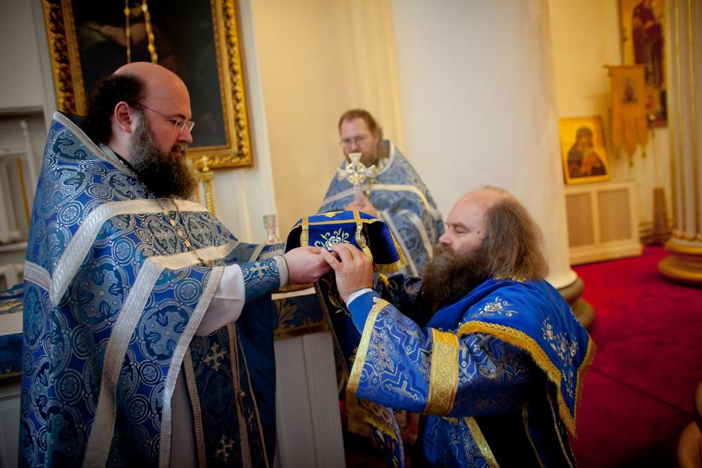…а затем дает ему покрытый дискос с Агнцем. Сам берет Потир. Если совершается богослужение, в котором принимает участие много священников, то старший берет Чашу, а его собратья – святые кресты, богослужебные сосуды.