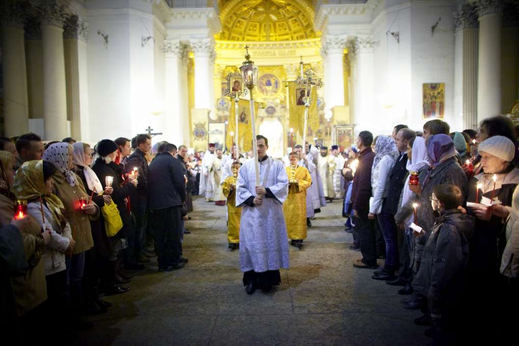 Постепенно загорается свет. Сначала тихо, потом громче и еще громче духовенство запевает: Воскресение Твое, Христе Спасе, Ангели поют на небесех…