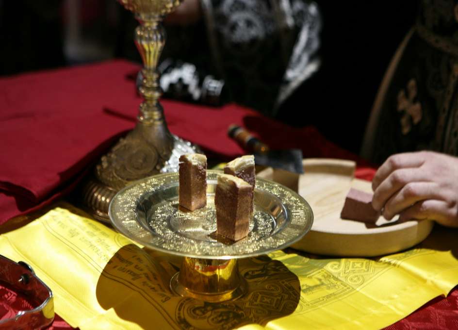 Затем одну часть Агнца опускает в Чашу, ничего не произнося. Три другие остаются на дискосе. Одна будет раздроблена для Причащения священнослужителей, две другие – для Причащения прихожан.