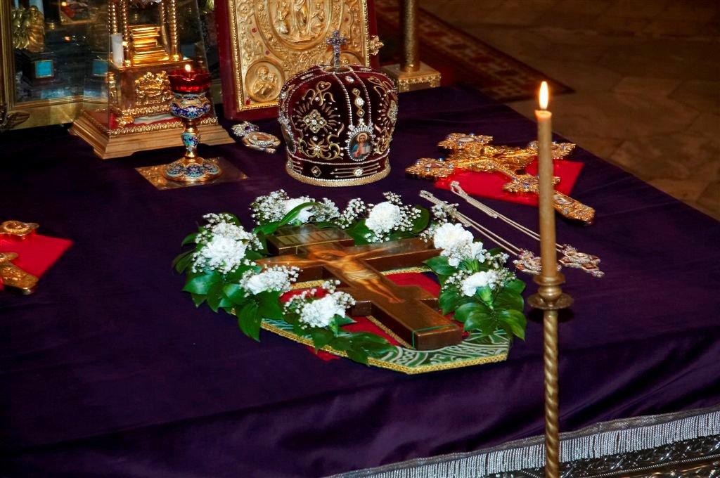 Перед началом вечернего воскресного богослужения на престол – на антиминс – кладут крест, увитый цветами (Евангелие, обычно лежащее на антиминсе, ставят рядом). Перед крестом зажигают свечу.