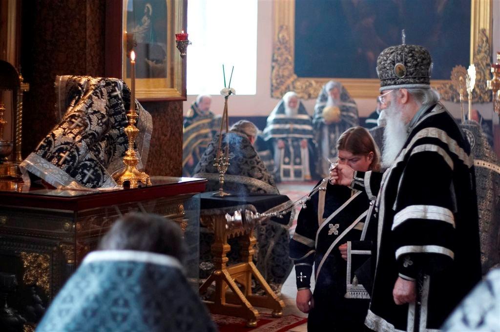 Духовенство в алтаре на коленях. Трио умилительно поет: ДА ИСПРАВИТСЯ МОЛИТВА МОЯ (можно прослушать ). Митрополит Владимир совершает каждение у жертвенника.