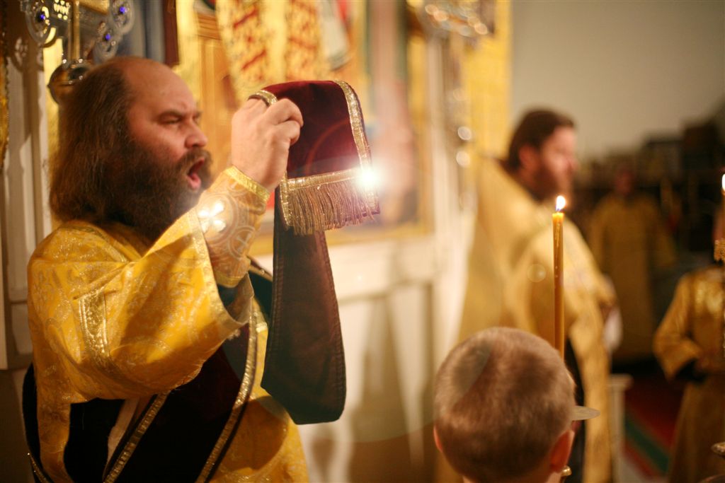 На этой фотографии мы видим, как диакон, произнося прокимен, воздел руку с орарем.