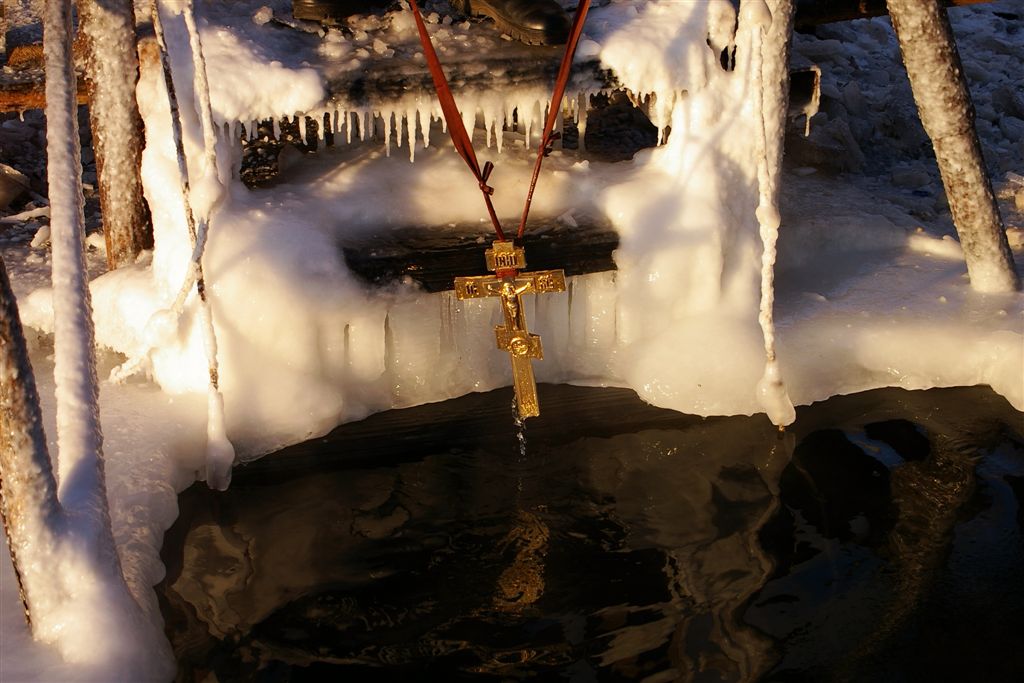 А на этой фотографии мы видим, как освящают воду в проруби, в пригородном озере.