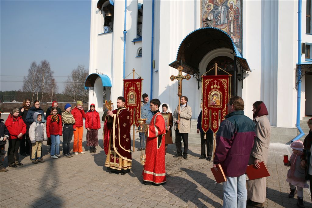 Начинается пасхальное богослужение с крестного хода. Потом этот крестный ход (вокруг храма) будет совершаться каждое воскресенье на протяжении 40 дней – до Вознесения. Все идут за священником и поют пасхальные гимны.