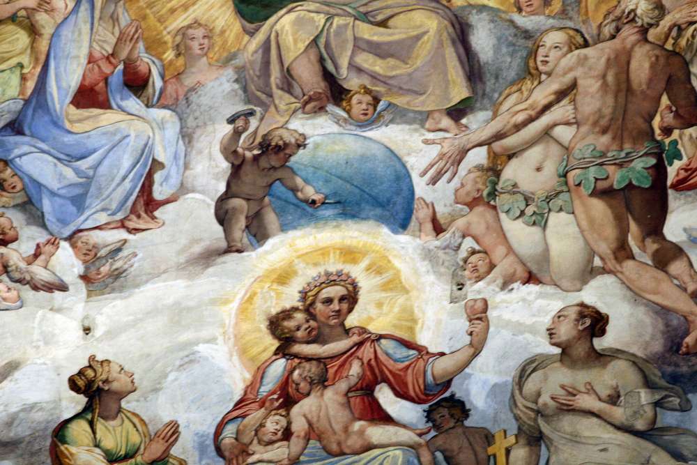 Фрагмент росписи, на котором изображен следующий момент: Ангел вколачивает какой-то штырь в свод неба, что приведет к разрушению неба и к концу нашего мира.