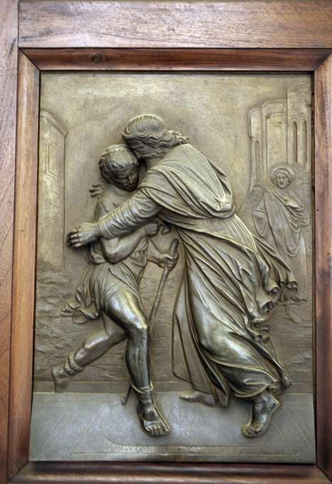 Барельефы на кабинках красноречиво показывают важность Таинства Покаяния. Вот, например, изображение блудного сына, вернувшегося к отцу. Отец вместо того, чтобы ругать сына, выбежал к нему навстречу и обнял блудное чадо…