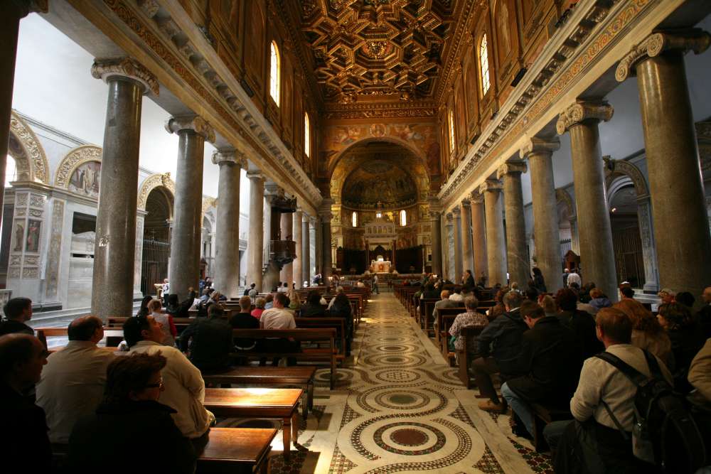 Входим в прохладу базилики – и застываем от красоты. Уйти отсюда сложно, и практически все туристы, зайдя на минуту в храм, остаются тут надолго. Видно, что все скамьи заняты, хотя богослужения нет.