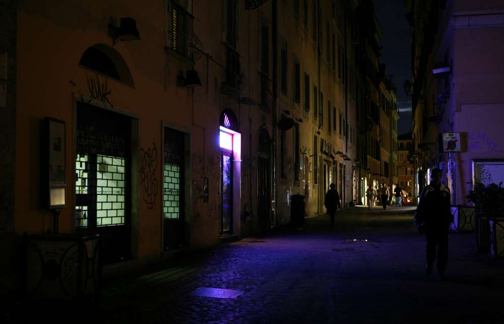Порой улицы, освещенные светом реклам, кажутся сюрреалистичными. Обратите внимание на решетку, которой закрыт магазин. Нас поражало, насколько итальянцы равнодушны к тому, чтобы заработать лишнее евро. Свои магазины и лавки они закрывают очень рано. Порой в 6 вечера, когда еще все кругом гуляют, а уже к 7-8 вечера закрыто все, кроме ресторанов и пиццерий да книжных магазинов. Итальянцы прекращают работать и идут гулять, посидеть в кафе или спешат домой, к телевизору с футбольным матчем.