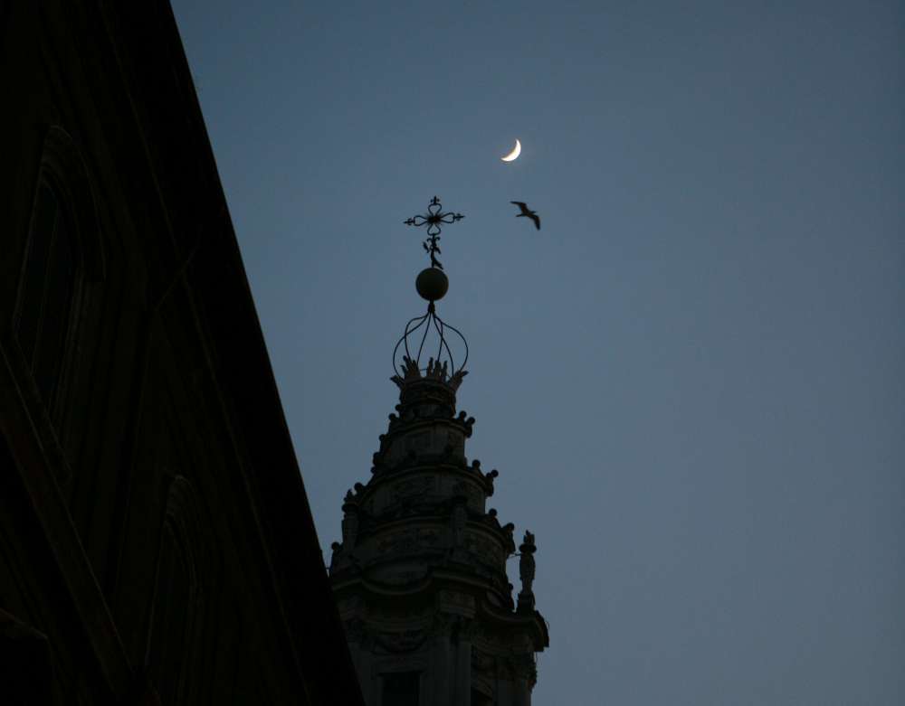 Увидев луну, я понял, что по пути домой представится возможность сделать снимок, в котором бы луна перекликалась с каким-то выразительным зданием, куполом, крестом (в Риме все это в изобилии). И вот такой вид нашелся. В это время мимо креста промелькнула птица. Пролетела одна, значит, могла пролететь и другая. Я начал ждать, приготовившись сделать снимок. Семья меня нетерпеливо окликала, и когда, через несколько минут, я уже хотел отказаться от своей затеи, вдруг появилась птица.