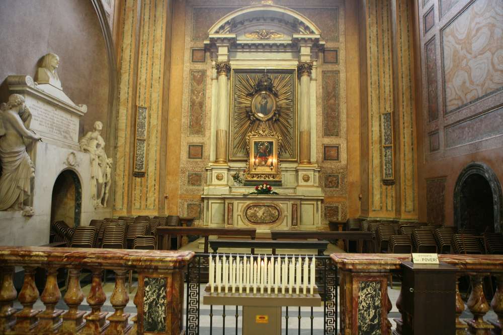Один из алтарей. Перед ним электрические свечи: бросил монетку – свечка зажигается на несколько минут. Над престолом – икона Божией Матери.