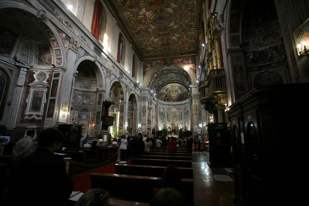 В храме голубое свечение. Это свет, льющийся из окон, подсветка… Храм назван в честь Святого Духа, и в самом деле атмосфера в храме напоминает небесную. Перевод названия храма «Санто-Спирито-ин-Сассиа» звучит как «Святой Дух в Саксонии». Невероятно возвышенная атмосфера, и всегда (а мы в этот храм заходили много раз) большое количество людей. Совершается Литургия…