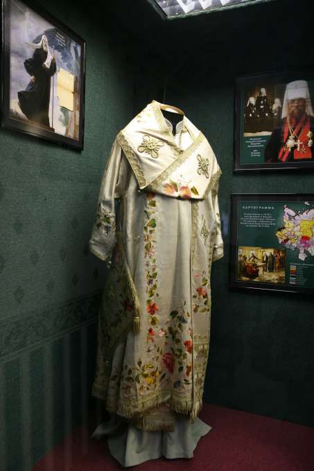 А это — комплект облачения новомученика митрополита Владимира (Богоявленского), мученически убитого в первый год революции, в январе 1918 года.