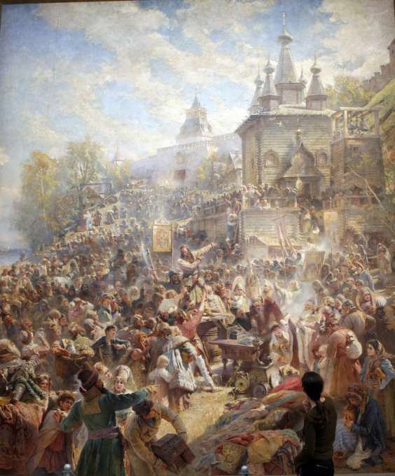Здесь много очень хороших полотен. Начали мы с отдельного зала, в котором экспонируется всего одна картина: «Воззвание Минина» К.Е. Маковского (1890-е). Картина тебя словно погружает в воссозданную художником реальность. Написанные на переднем плане фигуры выполнены точно в человеческий рост (сравните с настоящим человеком, стоящим у картины), постепенно перспектива уходит вдаль, и ты, невольно захваченный действием, переносишься умом в нарисованный мир.