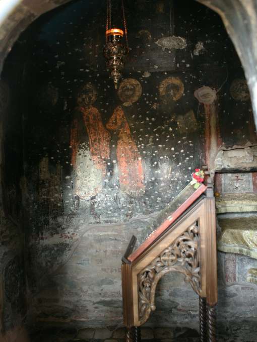 Они сильно пострадали при турках, бивших по стенам молотками (штукатурка, которой они замазывали росписи, могла лечь только на грубую шероховатую поверхность). Мы видим на фотографии древнюю фреску.