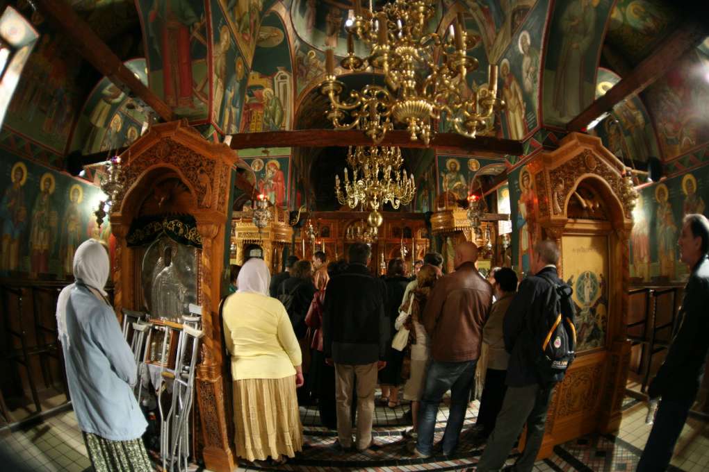 В храме монастыря. Слева – чудотворная икона, от которой проистекают исцеления людей, страдающих заболеваниями опорно-двигательного аппарата. Исцеленные больные оставляют костыли и уходят здоровыми.