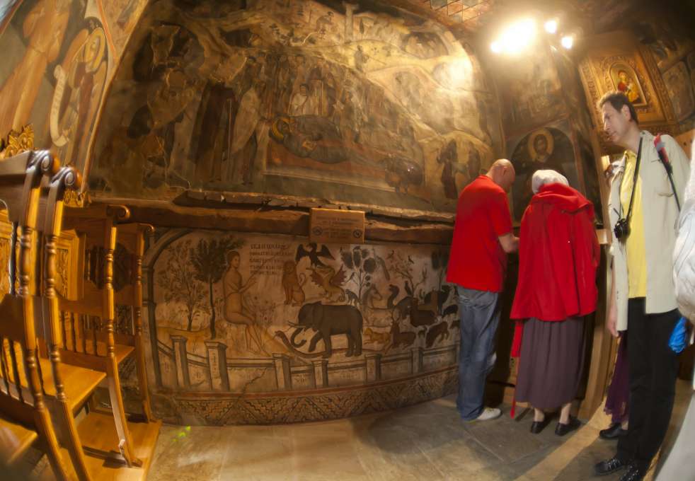 Уникальные древние фрески. На этой (особенно ценна нижняя часть) изображено, как Адам нарекает имена животным, которых к нему привел Бог. Автор – Феофан Критский, фреска была создана им в 1527 году.