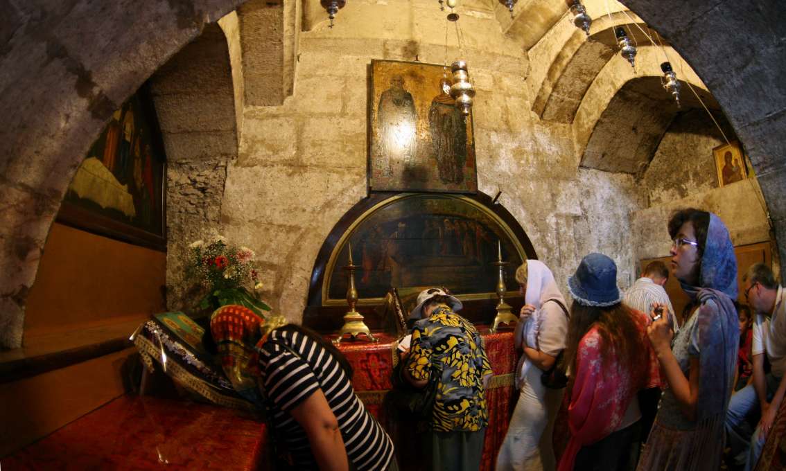 …маленькая ниша с гробами, в которых похоронены родители Божией Матери святые праведные Иоаким и Анна и ее супруг праведный Иосиф. На фотографии: паломники поклоняются святым родственникам Богородицы.