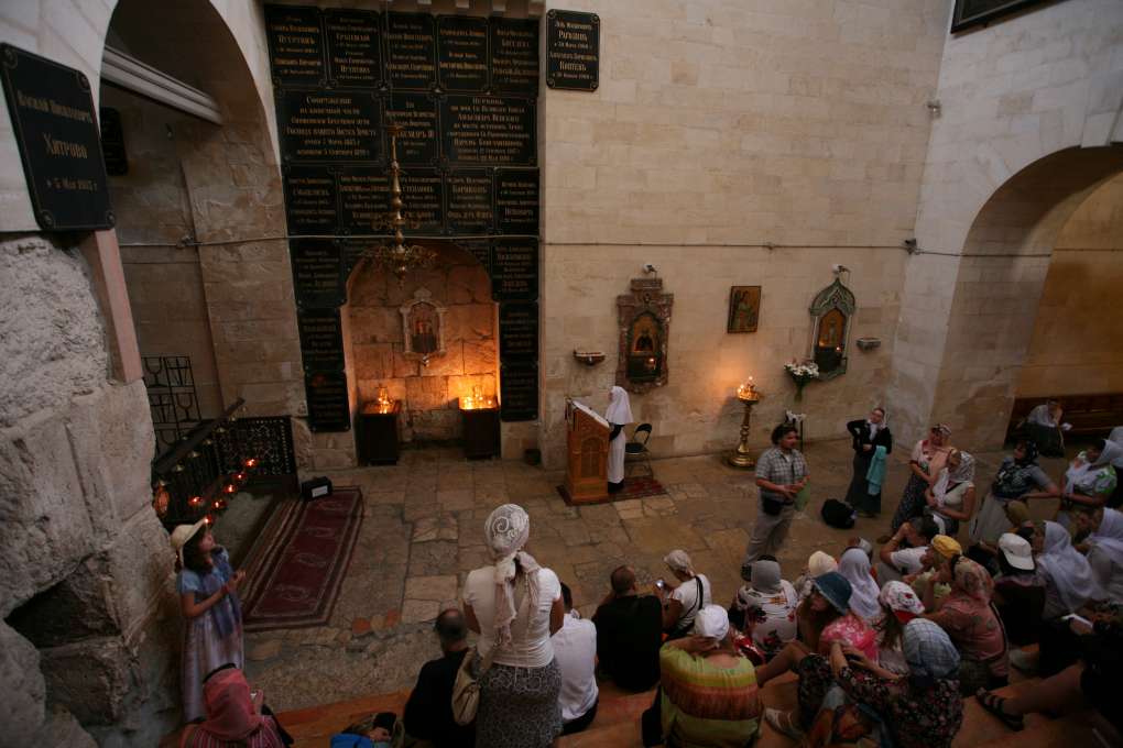 Здесь постоянно идет молитва. Под горящей лампадой монахиня читает «неусыпаемую», то есть постоянно читаемую, Псалтирь. Эта молитва возносится за всех, чьи имена начертаны на мраморных табличках. Но прежде всего, конечно, эта молитва совершается в знак благоговейного почтения и любви ко Христу, который в этом месте переступил порог городских ворот, идя на казнь. Этот порог, носящий название Порога Судных Врат, мы видим на фотографии слева. Над Порогом постоянно горят лампады.