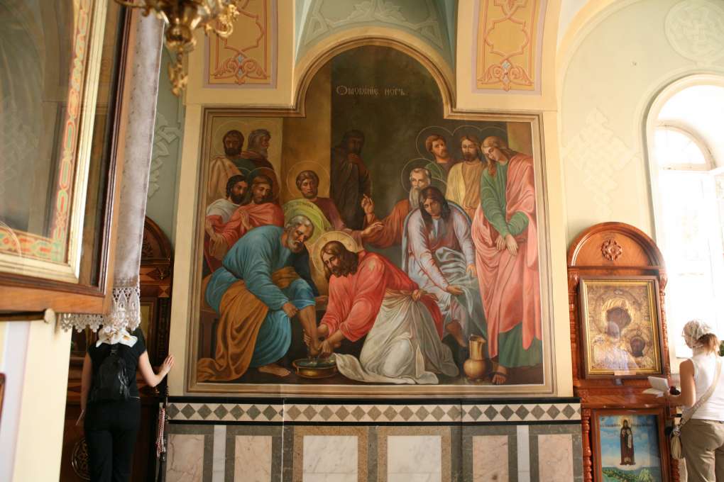 Редкая фреска: Спаситель умывает ноги ученикам. Возле этого образа можно размышлять и молиться о даровании смирения. Как прекрасно сказал об этом Христос: «кто хочет быть первым, будь из всех последним и всем слугою» (Мк. 9, 35). Если бы только мы чаще вспоминали о смирении, а не выпячивали себя, не лезли вперед… Смирившийся Христос – в этом нам поддержка и пример.