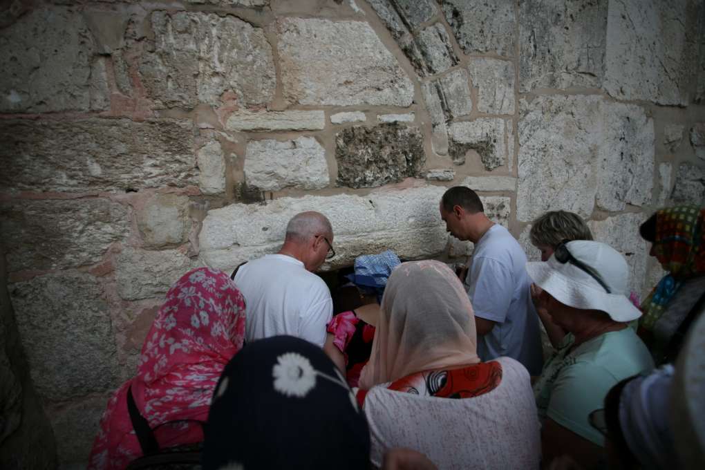 Помолившись святому Иерониму и сделав несколько снимков, возвращаюсь к нашей очереди. И совсем скоро мы, склонив головы, попадаем в Храм Рождества Христова. Когда-то, в Средние века, для того чтобы арабы-мусульмане не въезжали в храм на лошадях, как они любили делать, вход сделали очень низким. Теперь каждый входящий в храм должен, хочет он того или не хочет, поклониться.