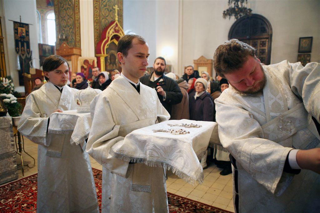 Иподиакон держит поднос, на котором лежат наперсный (надеваемый на перси – грудь) крест и панагия (в переводе с греч. – Всесвятая; так называется эта иконка-медальон потому, что на ней обычно изображена Божия Матерь).
