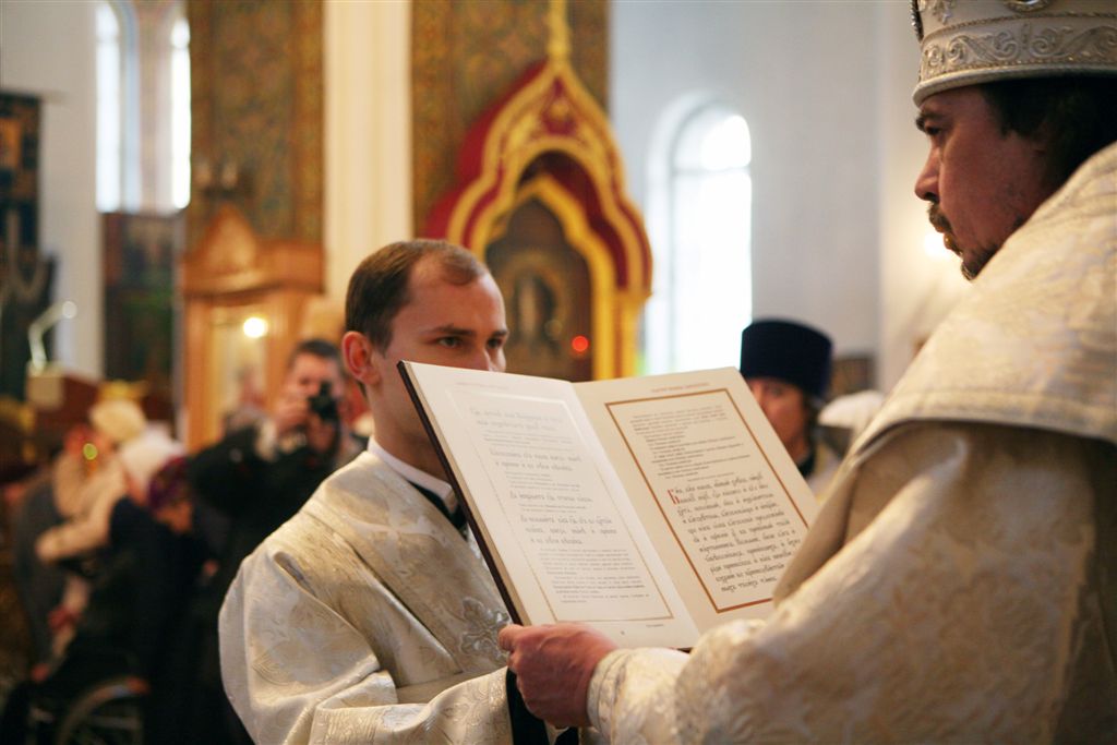 Иподиакон принес архиерею Чиновник – книгу, в которой помещены для епископа молитвы Литургии. Как во время служения Литургии священник читает определенные тайные молитвы, так и владыка про себя или вполголоса читает особые тайные молитвы.