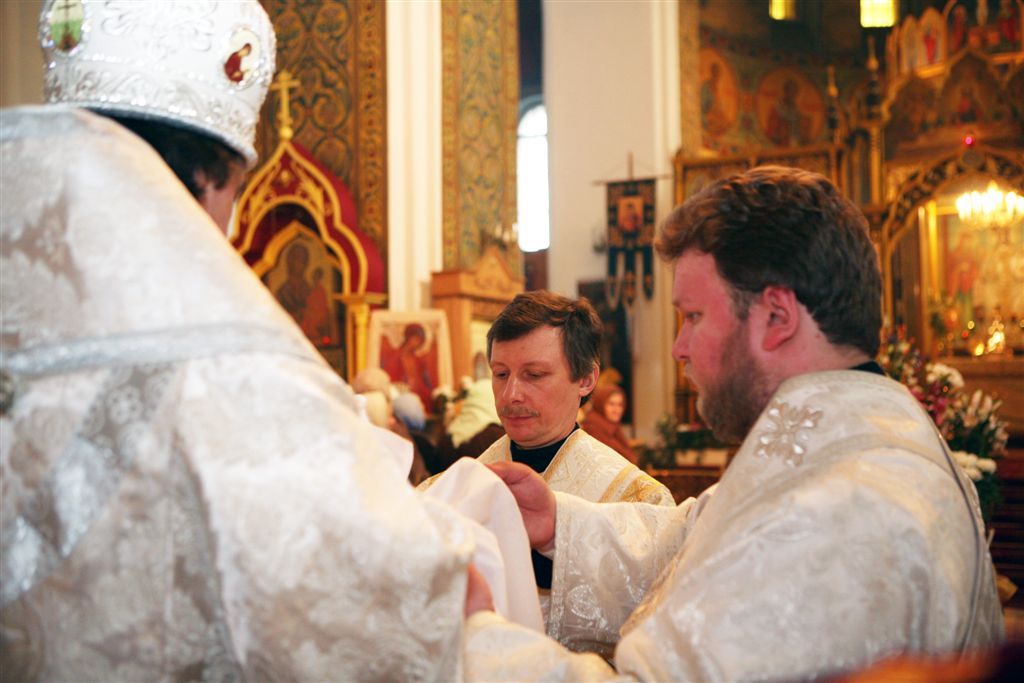 Иподиакон (в нашем случае – ставленник) приносит кувшин и омывает руки епископу. Это нужно для того, чтобы владыка совершал богослужение и касался святыни, очистившись. При омовении рук читается молитва: «Омою в невинности руки мои и обойду жертвенник Твой, Господи, чтобы возвещать гласом хвалы и поведать все чудеса Твои. Господи! возлюбил я обитель дома Твоего и место жилища славы Твоей. Не погуби души моей с грешниками и жизни моей с кровожадными, у которых в руках злодейство, и которых правая рука полна мздоимства. А я хожу в моей непорочности; избавь меня, и помилуй меня. Моя нога стоит на прямом пути; в собраниях благословлю Господа». Видимое омовение рук символизирует освобождение души от всего постороннего и отвлекающего от молитвы, ибо «приходящим на всесвятейшее священнодействие подобает очиститься даже от окраинных фантазий души» (св. Дионисий Ареопагит).