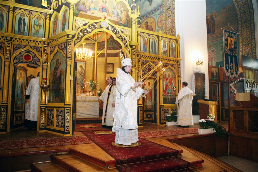 Священнослужители присоединялись к владыке. Диакон вносил в храм Евангелие, епископ всходил по ступеням храма, проходил по солее (дорожке, ведущей в алтарь) и заходил в сам алтарь.