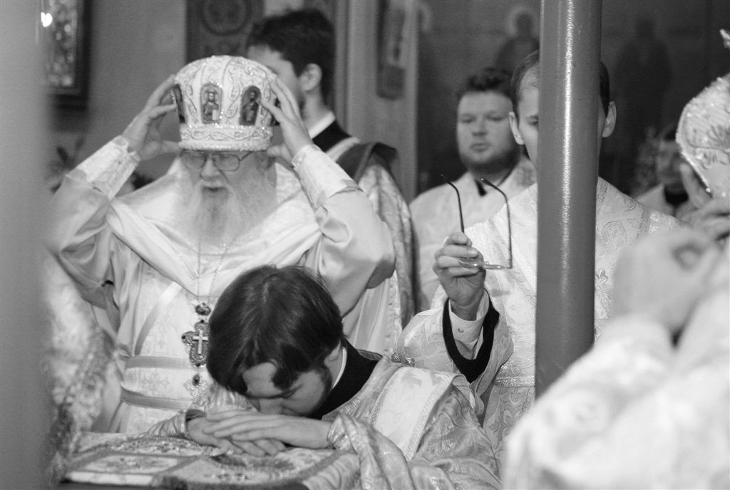 Обратите внимание на замечательные динамичные подробности происходящего. Священнослужители снимают головные уборы ввиду торжественности и святости момента, а владыке передают очки. Сейчас он будет читать молитвы.